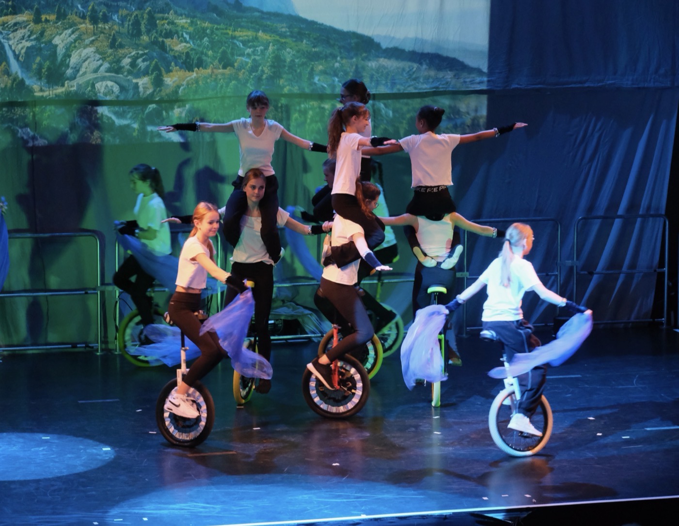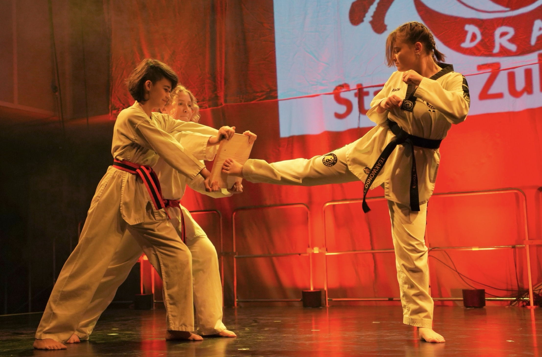 Kampfkunst gabs in Form von Taekwondo und Kickboxen. Was auf Rädern respektive Rollen dahergefahren kam - also Kunsträder, Rollschuhe und Einräder („Wheels in Motion“ / Leitung: Britta Hartmann) - erfreute ausnahmslos durch farbenfrohe Kostüme und rasante Bewegungsabfolgen.