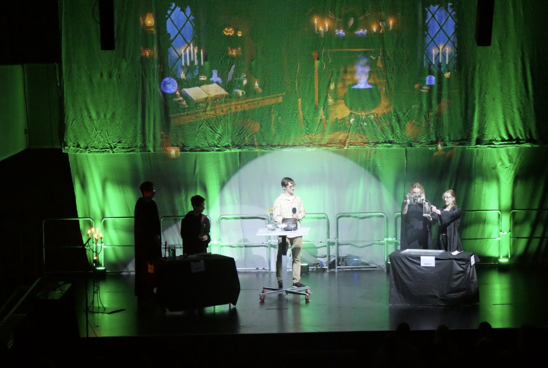 Den Auftakt lieferte das P-Seminar Chemie (Leitung: Karen Stahl) mit einem experimentellen Hexen-Wettstreit à la Harry Potter, souverän präsentiert von Constantin Veit: Schaum verwandelte sich in Farbe, Wasser wurde zu Bier – natürlich alkoholfrei!