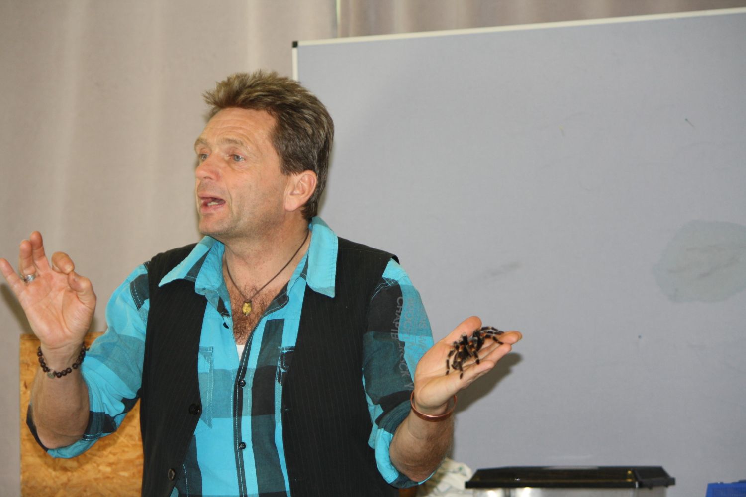 Manfred Werdan weiß scheinbar alles über Reptilien und Gliedertiere. Die Schüler erhalten erstaunlich viele, manchmal nahezu überfordernd viele Informationen und dürfen neben den genannten Tieren auch noch Landschildkröten, Axolotl (ein Amphib mit nachwachsenden Gliedmaßen), Hundertfüßer, Bartagame, Gottesanbeter, Skorpione, Stabheuschrecken und sogar eine mexikanische Rotknie-Vogelspinne bewundern.