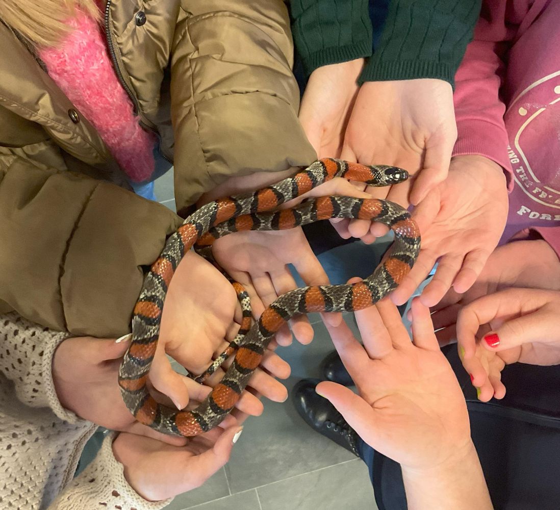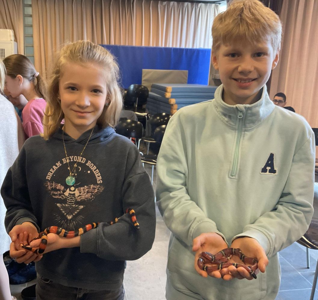 Ende Januar 2025 durften wir einen seit Jahren willkommenen Gast begrüßen, der auch dieses Mal wieder mit einer Vielzahl an geheimnisvollen Kisten anreiste. M. Werdan hatte eine beeindruckende Auswahl an exotischen Tieren mit im Gepäck: kleine Landschildkröten, Axolotl, ein Jemenchamäleon, mehrere Königspython und Königsnattern sowie als Highlight die Europäische Hornotter, eine Giftschlange, die man sogar im südlichen Österreich antreffen kann. Zwar handelt es sich bei diesen Tieren nicht um Streicheltiere, dennoch durften die meisten Tiere auf die Hand genommen und genauestens begutachtet werden. Dies war sicherlich ein einmaliges Erlebnis für die Schüler und Schülerinnen der 6.Klassen! Herr Werdan ließ uns auch an seinem großen Wissen über diese Tiere teilhaben und erzählte lustige Anekdoten über die Erlebnisse mit den Exoten.