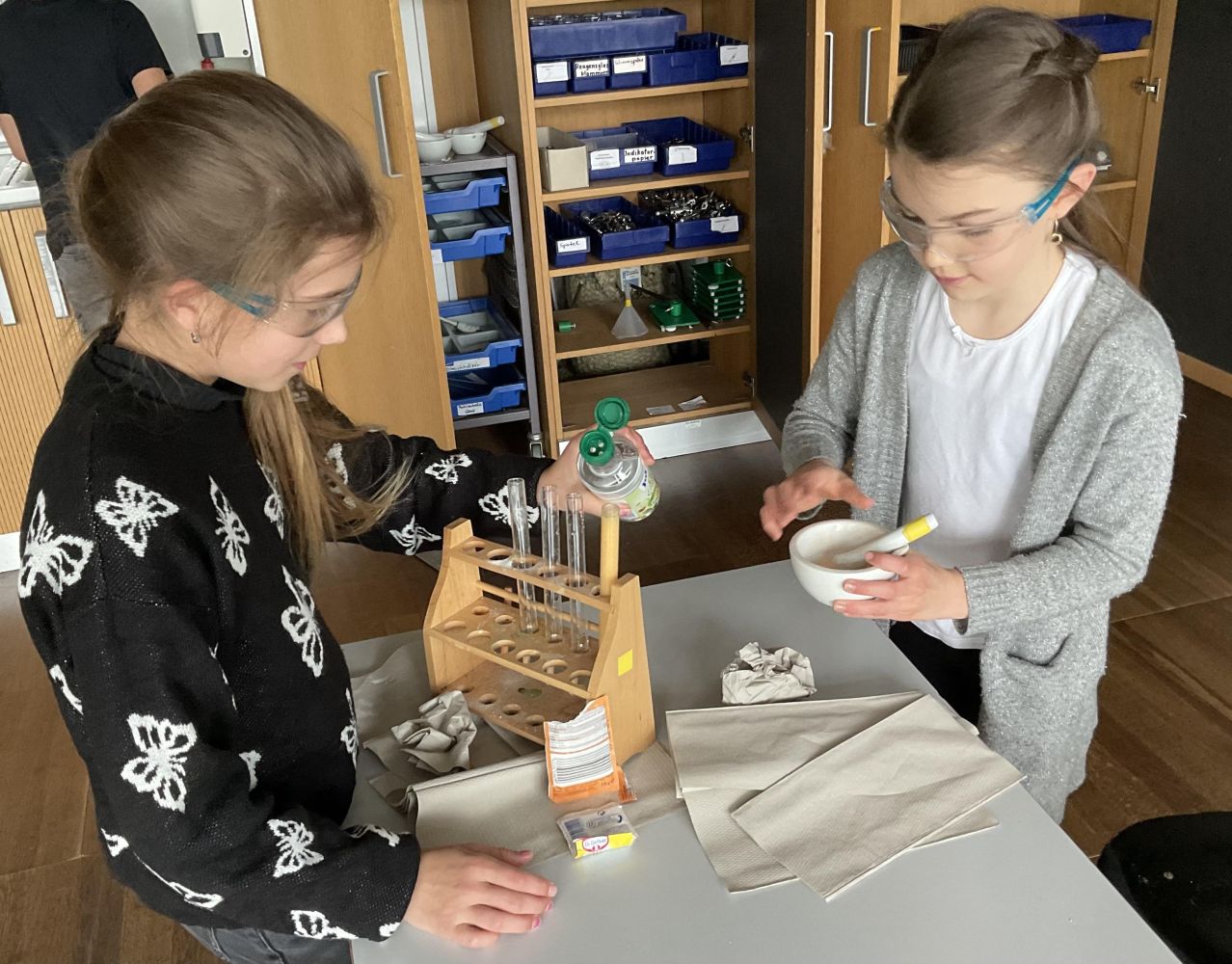 Neben dem Schwerpunkt Biologie, der zur Hälfte zum Fach Natur und Technik zählt, gibt es in der fünften Klasse auch einen Schwerpunkt Naturwissenschaftliches Arbeiten. Hier steht das Experimentieren im Vordergrund. Mit großer Begeisterung basteln, forschen, untersuchen, testen, protokollieren, sammeln und beobachten die Schülerinnen und Schüler.